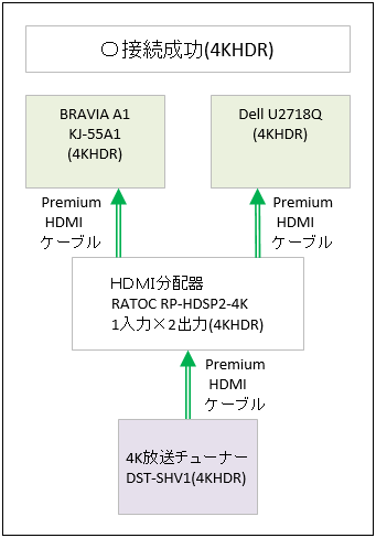 同様に4K放送チューナー DST-SHV1(4KHDR)の出力をRP-HDSP2-4Kで分配し、4Kテレビと4Kモニターに、4KHDRで出力できた。