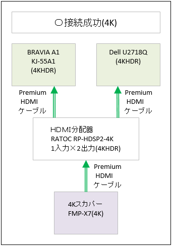 4Kスカパーチューナー、FMP-X7の出力をRP-HDSP2-4Kで分配し、4Kテレビと4Kモニターに出力できた。