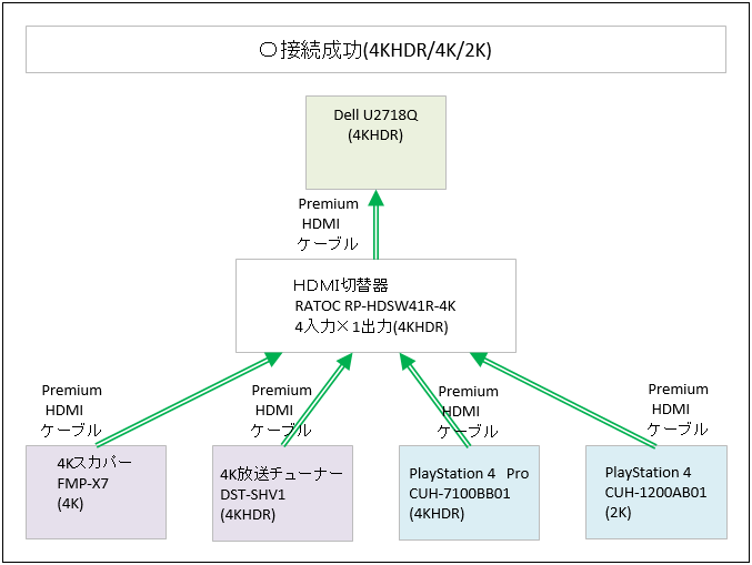 4台の異なる出力のデバイスを、RATOC RP-HDSW41R-4Kで切り替えて、4KモニターにHDMI入力し、それぞれの出力に合わせて適切な表示で切り替えられた。4KHDRも問題なかった。